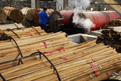 蒸煮碳化,將去掉竹片中的營養(yǎng)成分,使得制造成的竹板材產(chǎn)品質(zhì)地更加緊密結(jié)實(shí),并且不防蟲防蛀。