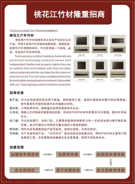 湖南桃花江竹材科技股份有限公司是湖南生產(chǎn)環(huán)保竹材的廠家,地處提名"楠竹之鄉(xiāng)"——湖南益陽市桃江縣,竹子資源得天獨(dú)厚。公司成立于2001年7月,注冊(cè)資金5076萬,為湖南省農(nóng)業(yè)產(chǎn)業(yè)化龍頭企業(yè)和湖南省林業(yè)工業(yè)龍頭企業(yè),“桃花江”牌系列竹材為湖南竹材產(chǎn)品。公司為中國林重點(diǎn)龍頭企業(yè)和國家高新技術(shù)企業(yè)。公司通過了ISO9001:2008國際質(zhì)量體系認(rèn)證和ISO14001:2004環(huán)境管理體系認(rèn)證。