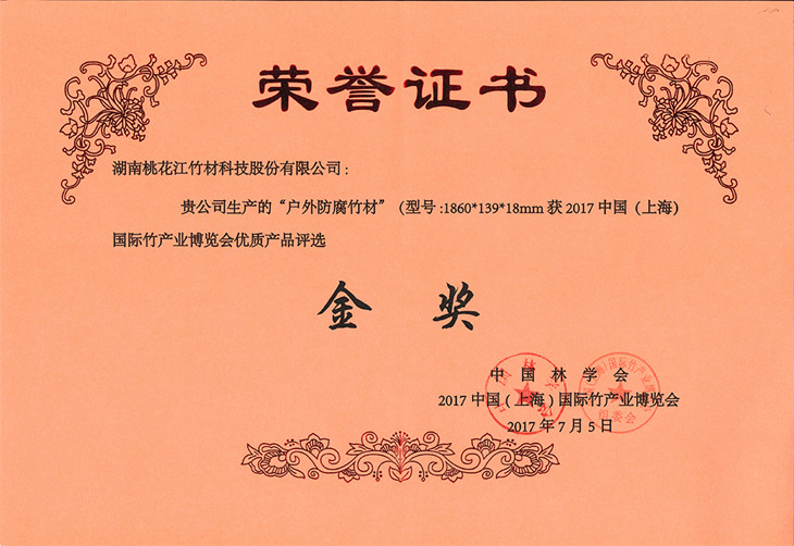 湖南桃花江竹材科技股份有限公司生產(chǎn)的戶外防腐竹地板在2017年7月中國(上海)國際竹產(chǎn)業(yè)博覽會中榮獲金獎,該獎項由中國林學(xué)會、中國(上海)國際竹產(chǎn)業(yè)博覽會頒發(fā)。湖南桃花江竹材科技作為中國竹材領(lǐng)域高炭防腐技術(shù)的發(fā)明者,在中國竹材領(lǐng)域有著舉足輕重的地位。湖南桃花江竹材科技一直專注與于竹材的戶外運用研發(fā)與創(chuàng)新,為全球客戶提供優(yōu)質(zhì)竹材。